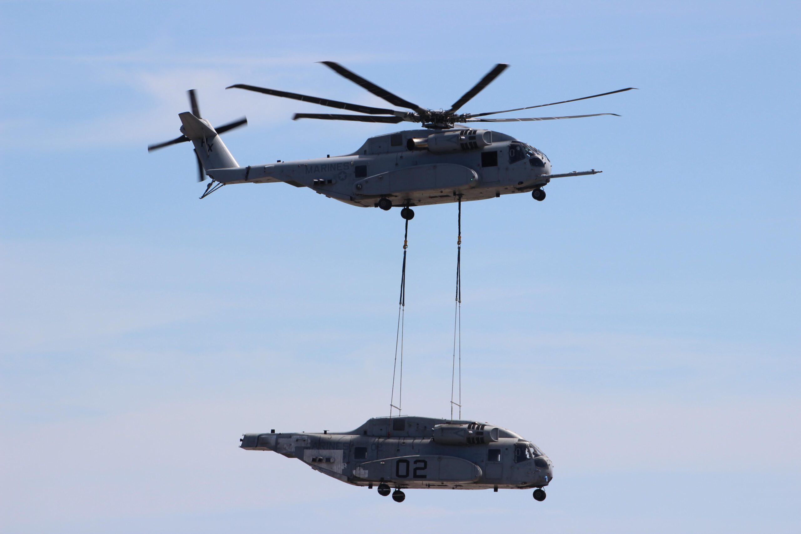 The CH-53K King Stallion helicopter, under the direction of H-53 Heavy Lift Helicopters Program Office (PMA-261), achieved a major milestone by successfully lifting another CH-53K King Stallion. The test, performed by Air Test and Evaluation Squadron 21 (HX-21), is part of the CH-53K aircraft recovery rigging evaluation and a critical step toward developing new operational capabilities and procedures for the CH-53K fleet.